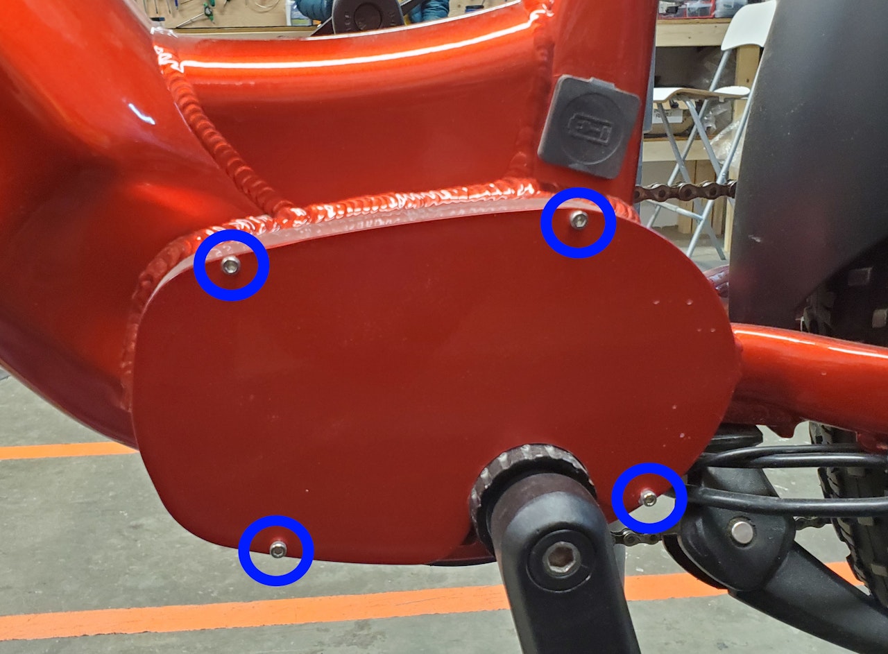 Open up the controller compartment on the non-drive side of the bike. To do this remove the 4 circled screws with a 2.5mm Allen Key.