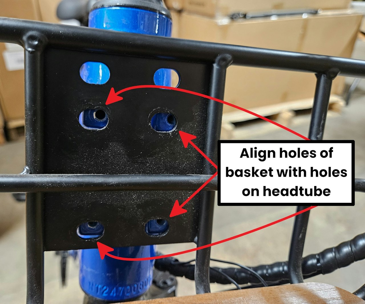 Take your basket. Line it up with the mounts to confirm which holes on the basket line up with the holes on the frame.