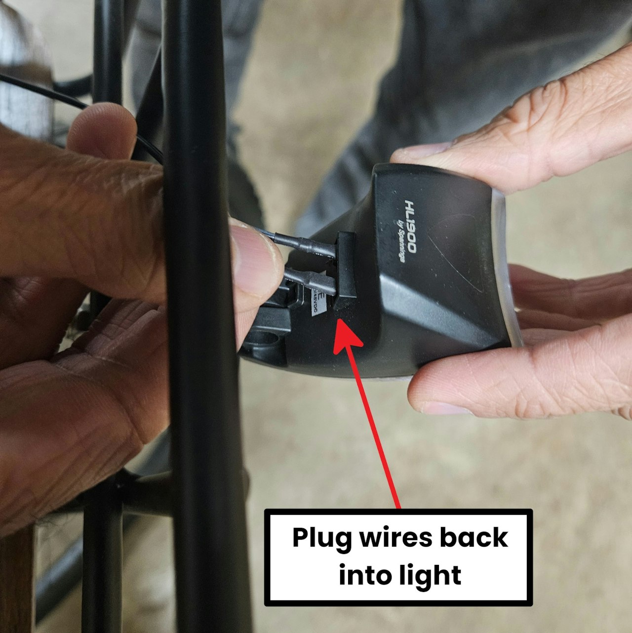 Lastly reconnect the power wires to the headlight. If your headlight power wires are long enough gently pull them out from the frame and reconnect them to your headlight in the same way there were previously connected!