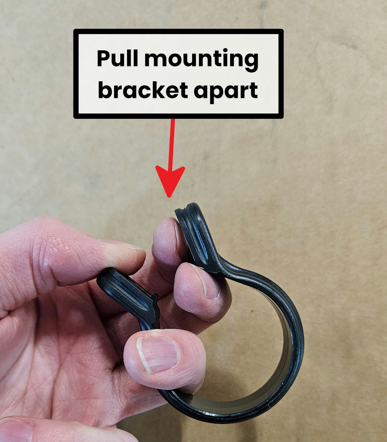 Take each circular mounting bracket. Gently pull it apart as demonstrated in the first image - this is needed to open up some packaging holding this shut during shipping.