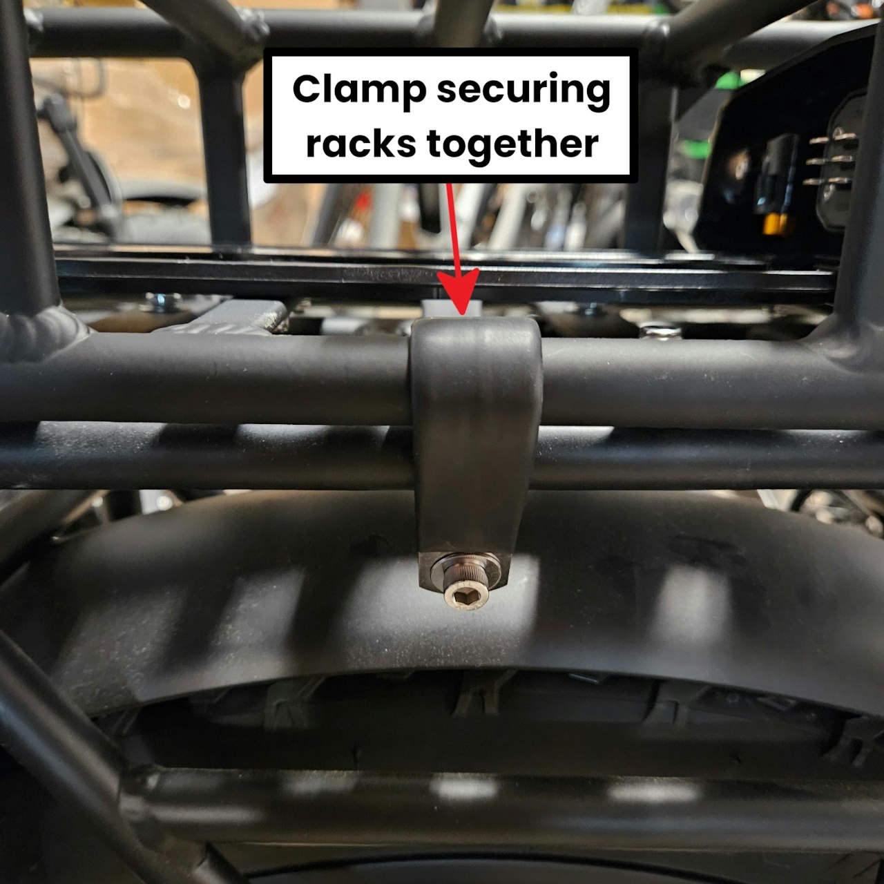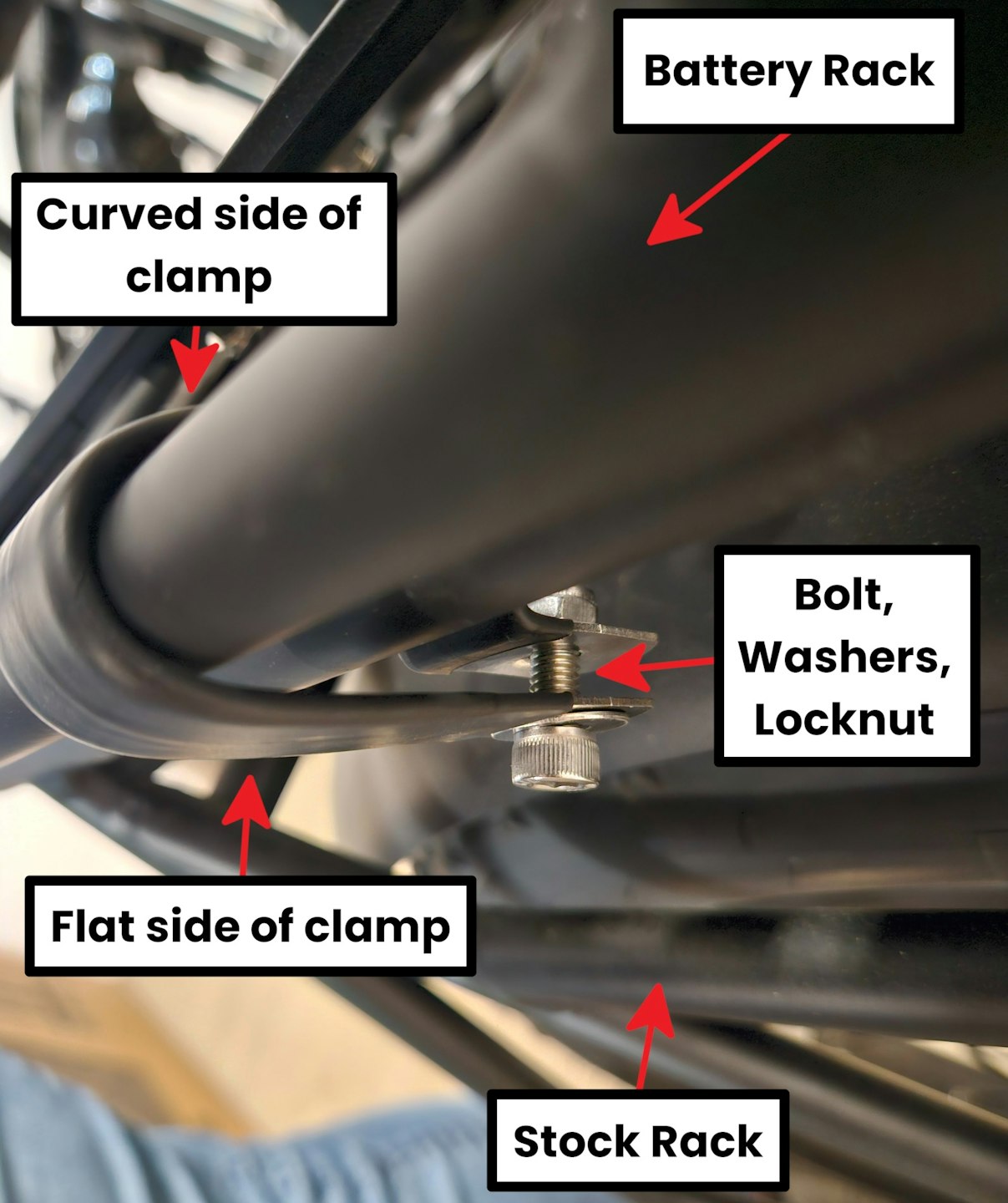 Slide one clamp onto the lefthand side of the rear rack. Ensure the flat side of this faces downwards, and the upper, curved side should fit nicely over the stock rack, and the battery rack.