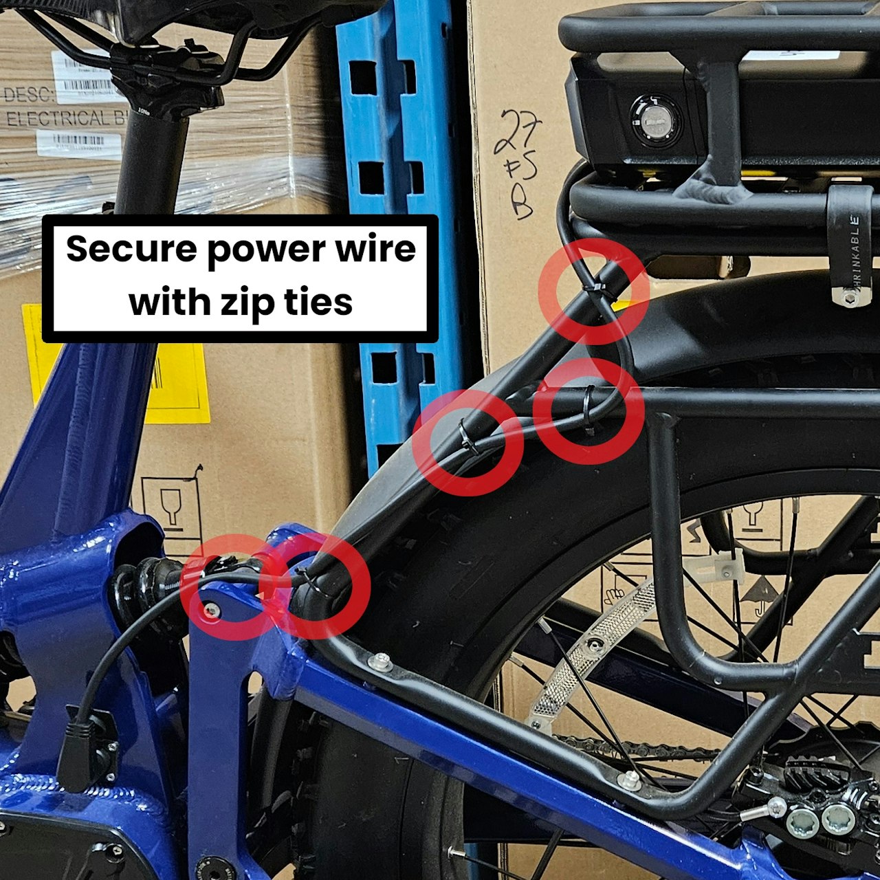 Use some zip ties to secure the power tire to the rear rack and the bike. See the attached image for suggested locations for some, but you can add more or less in other locations as needed!