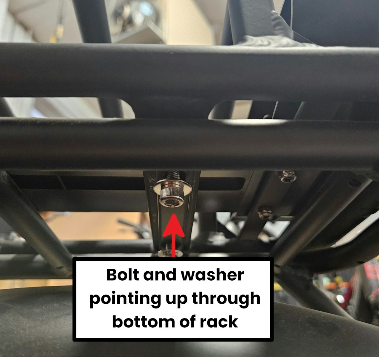 Push a bolt UPWARDS, through a washer and through the hole.