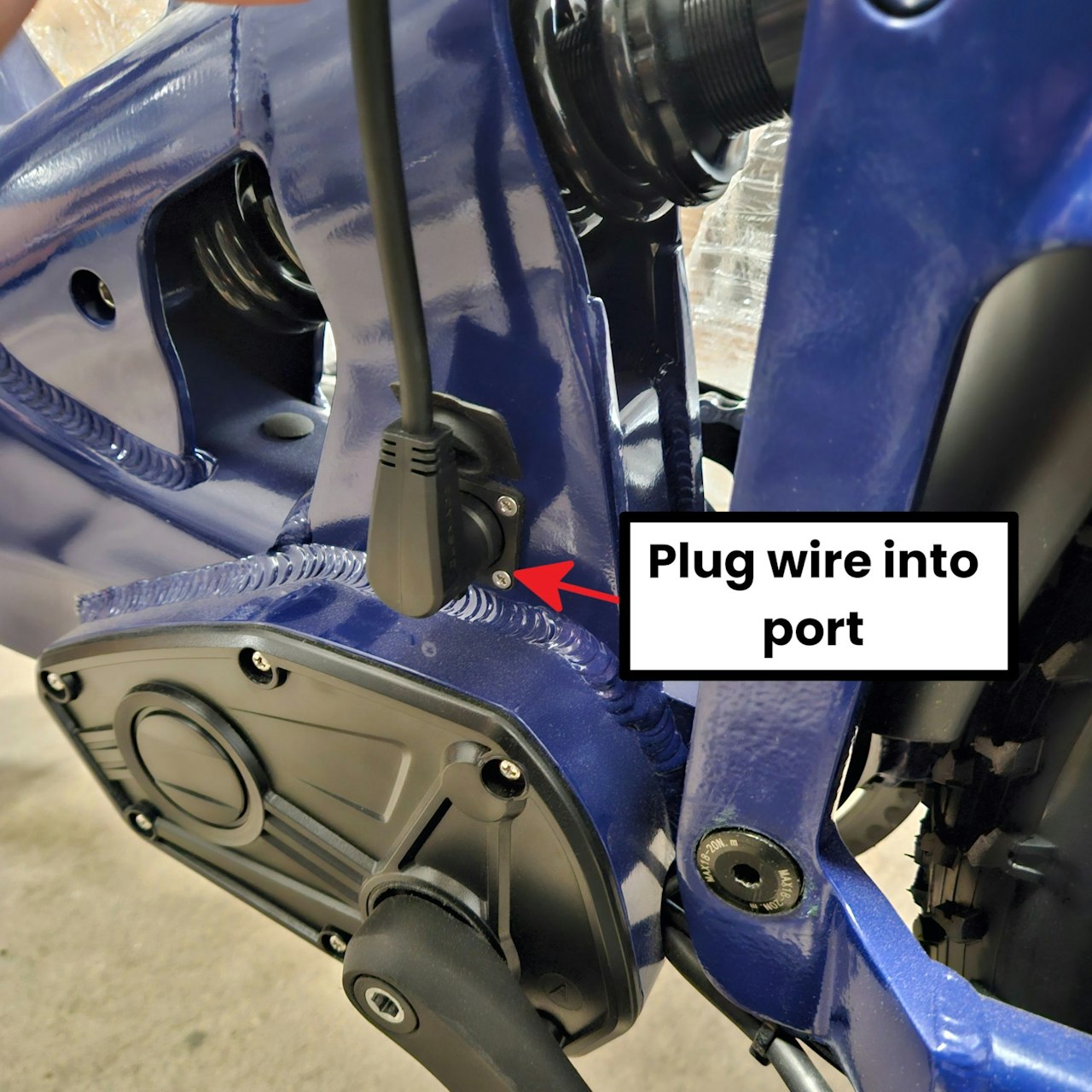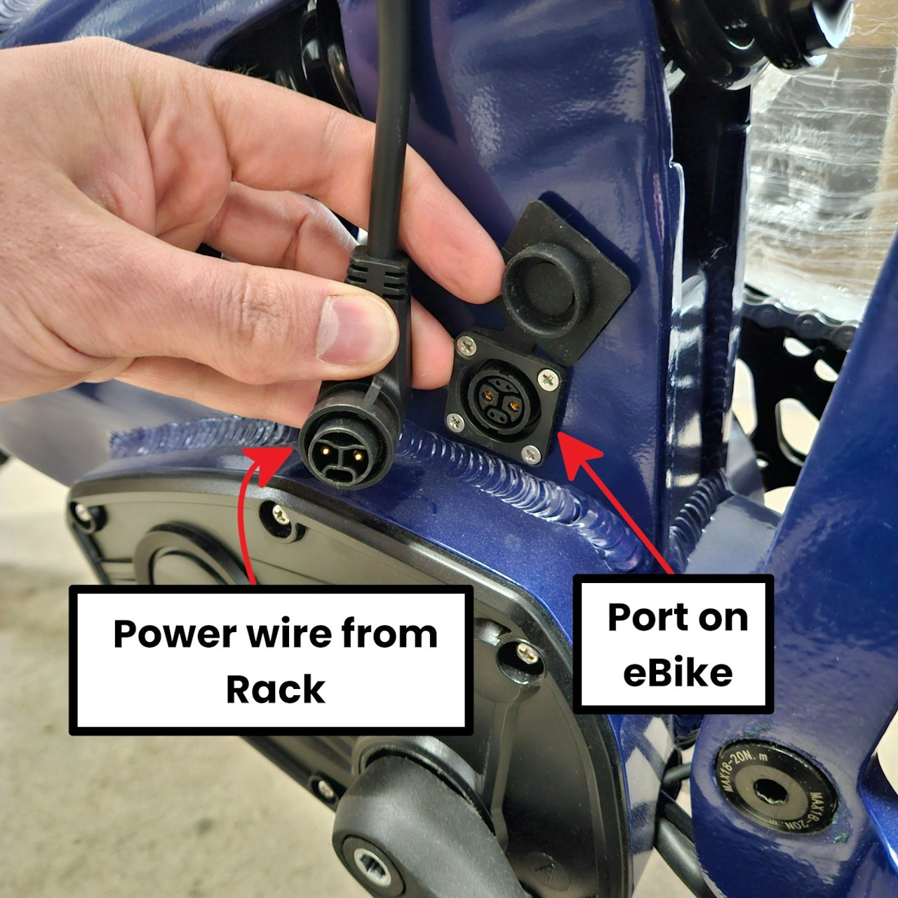 Plug the Power wire from the rack into the corresponding port of the eBike.