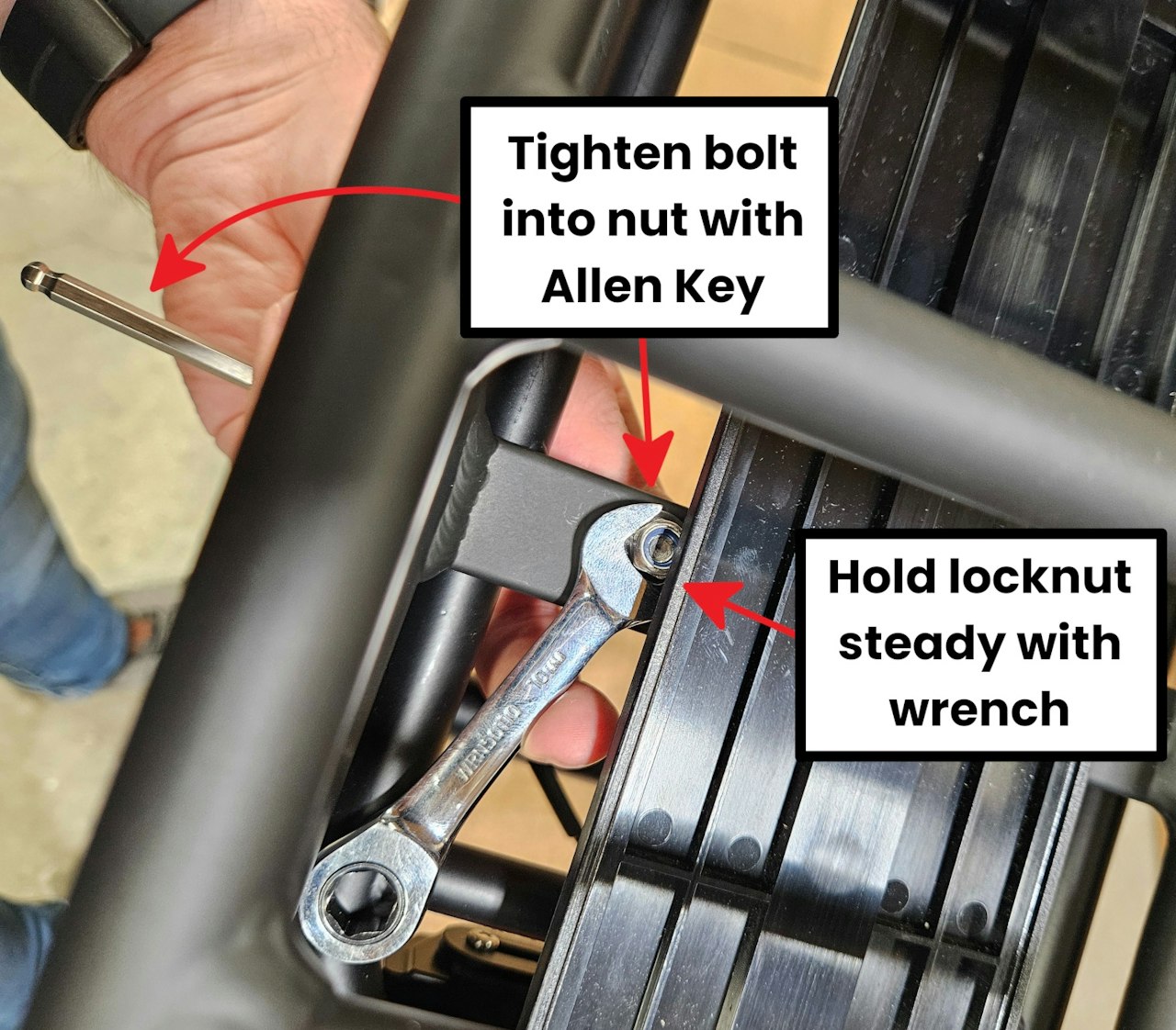 Go to each of the 6 bolts you have installed. Tighten them 1 by 1, using the Allen Key to tighten the bolt while you hold the bolt steady with the wrench