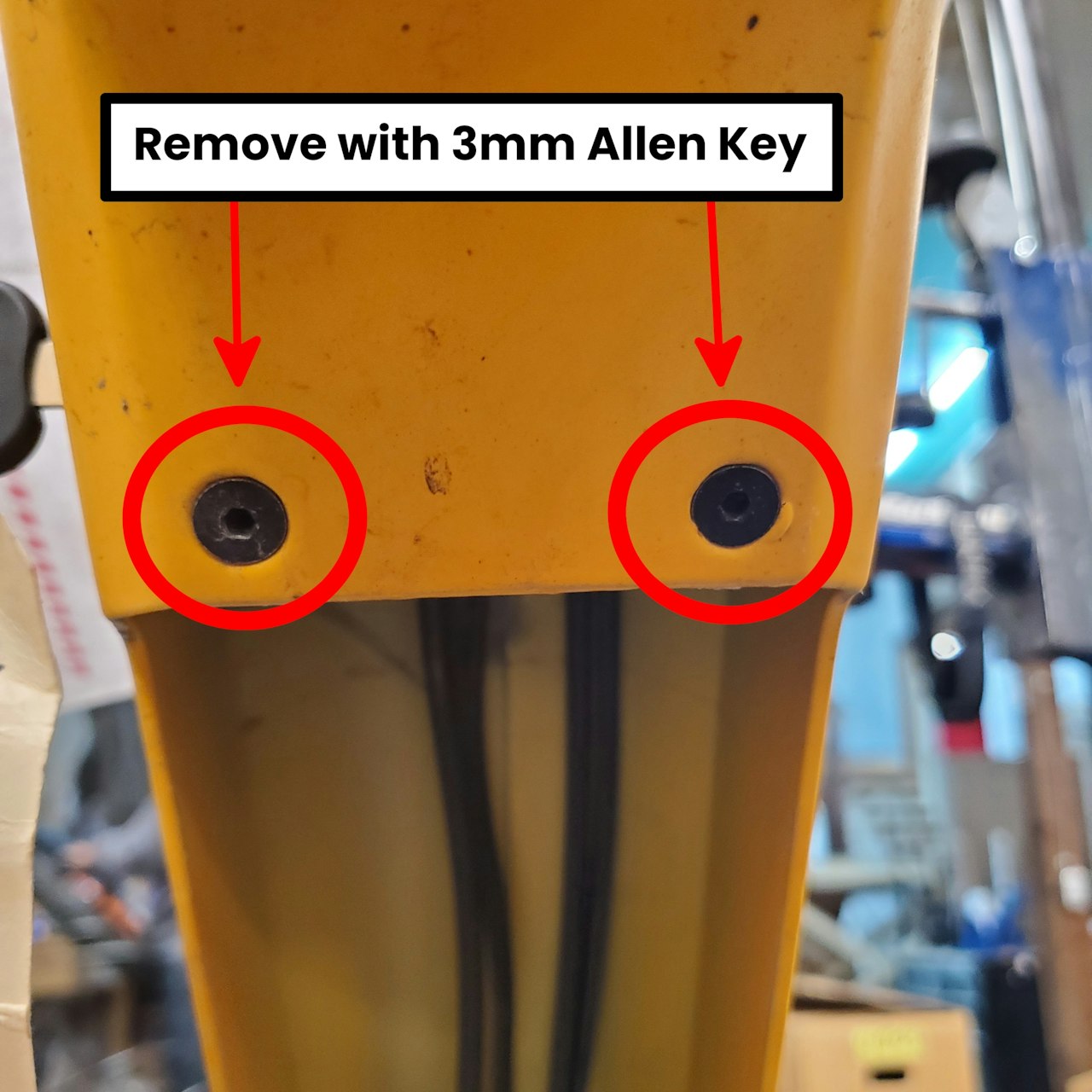 Remove the two circled bolts at the bottom of the upper half of the downtube that attaches the battery lock to the bike. With the bolts removed, you can slightly rotate and wiggle the lock mount so it can be slid out from the frame.