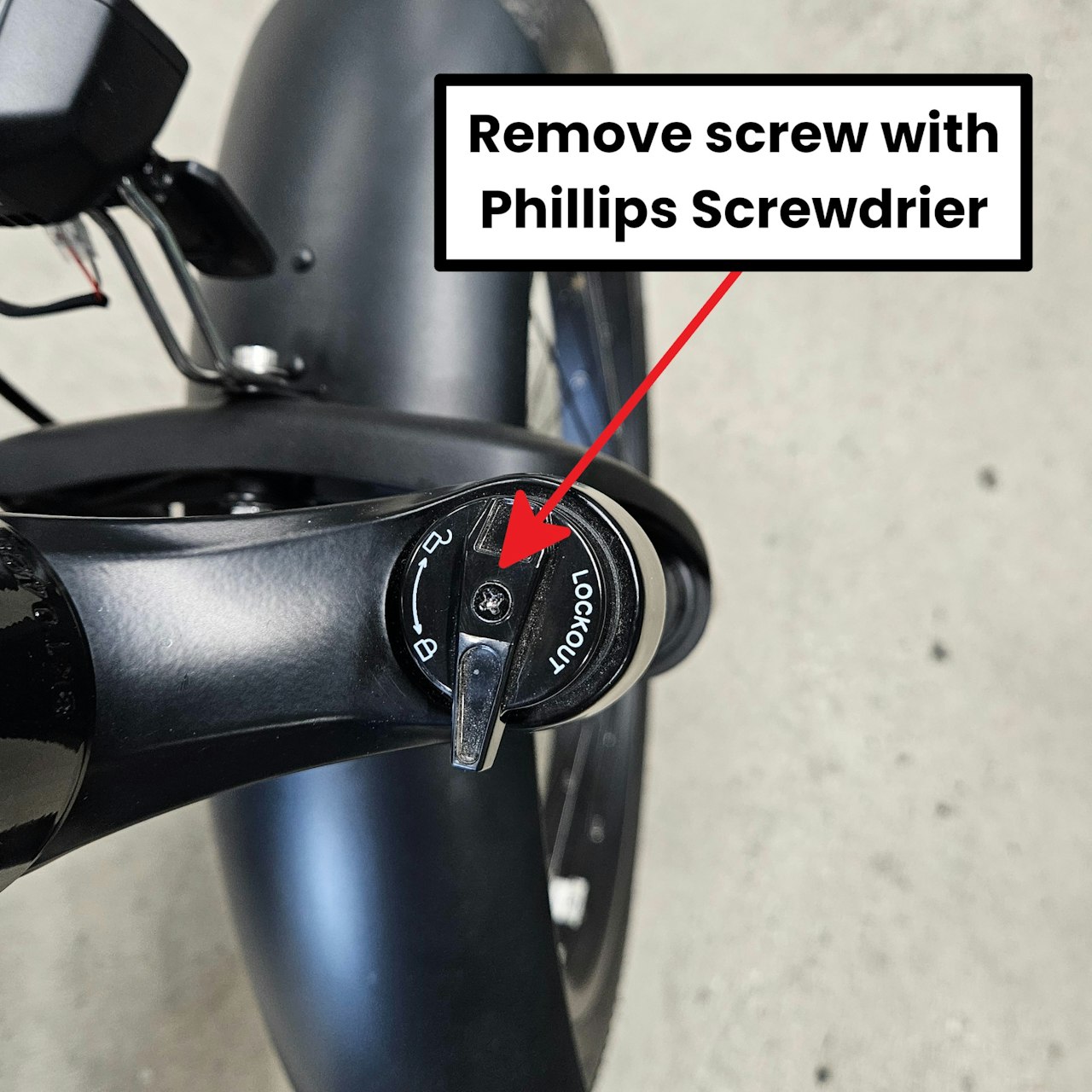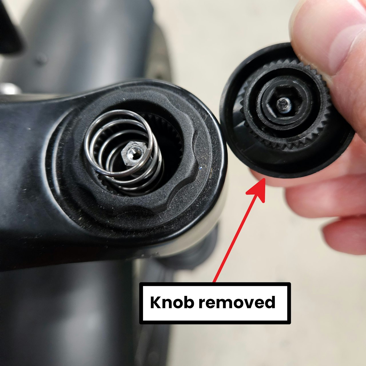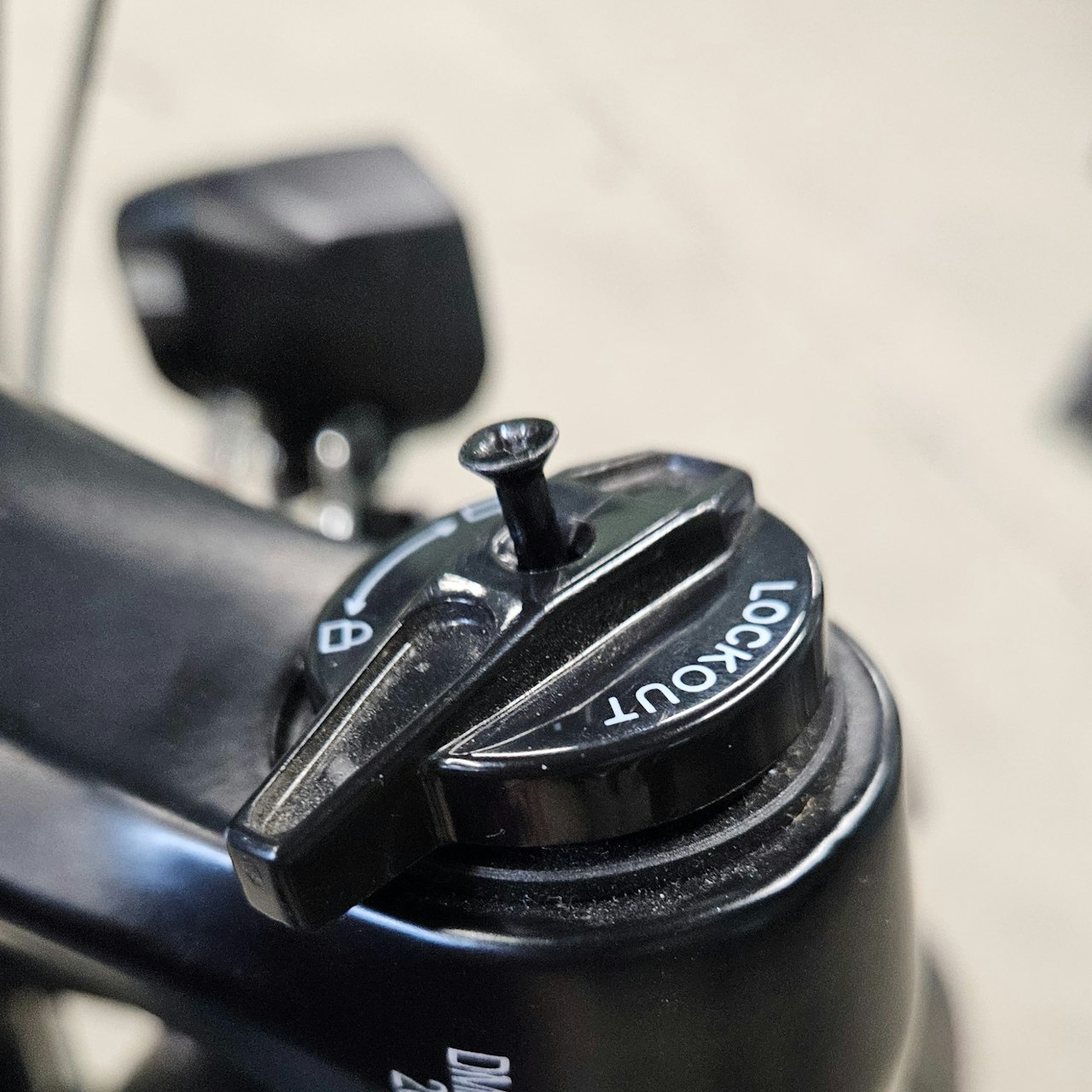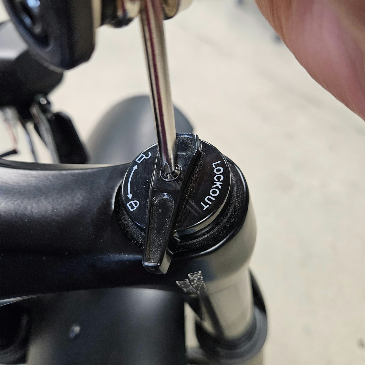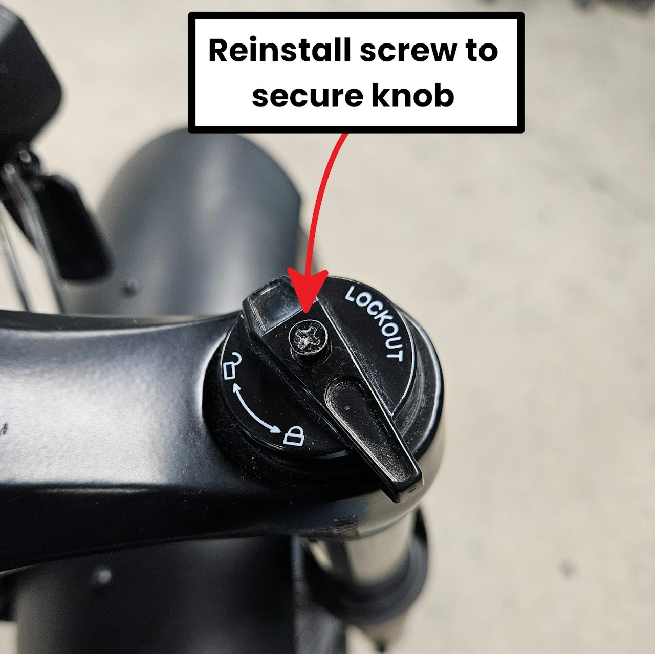 With the lockout kob positioned where you would prefer it, tighten the screw back into the top of it to reinstall the knob onto the fork.