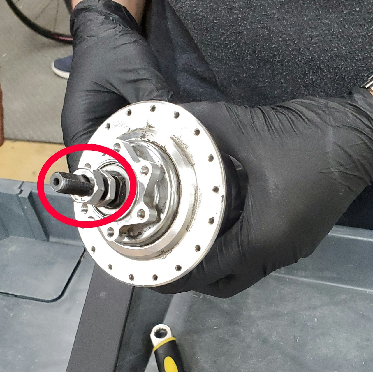 This service can be performed with the hub still laced into the wheel or with the hub standing by itself. However, the rear wheel must be removed from the bike to do this.