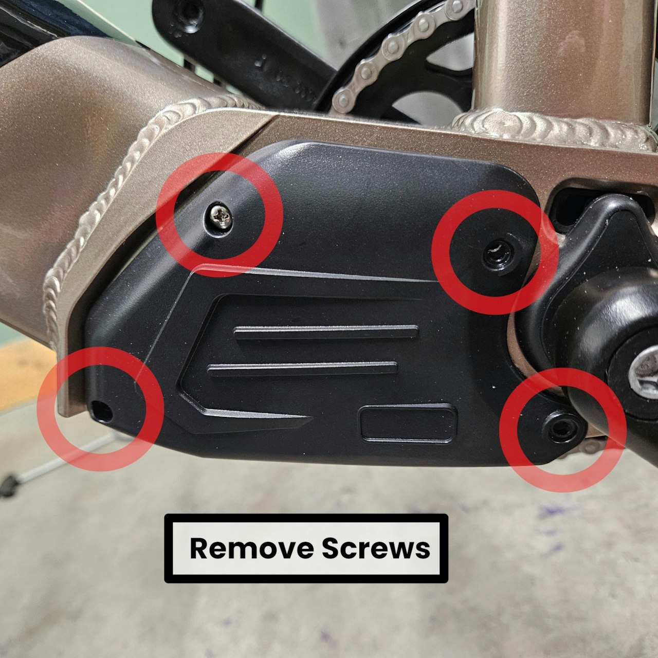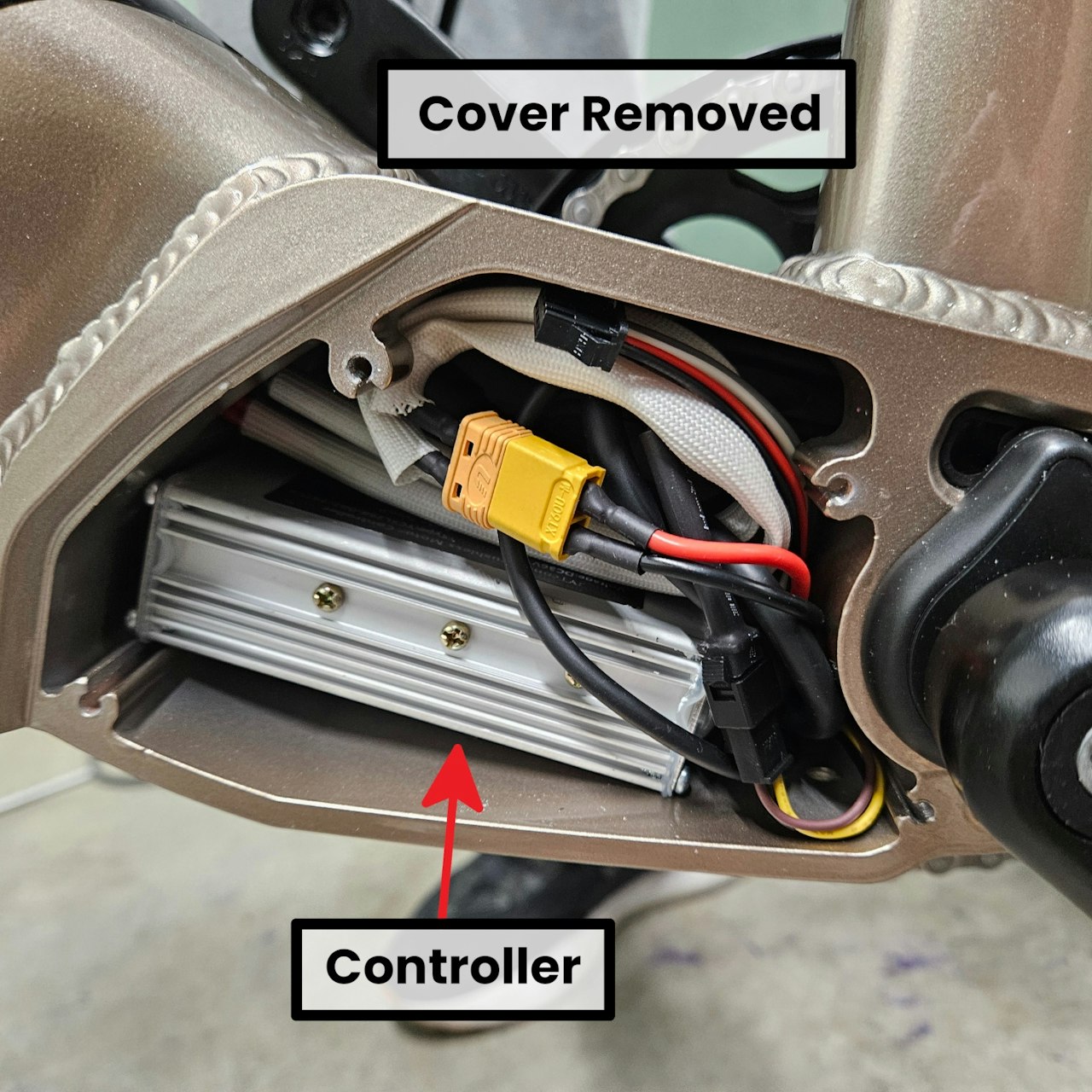Go to the Non-Drive side of the bike. Remove the 4 screws securing the "Controller Cavity Cover" to your bike with a phillips screwdriver.